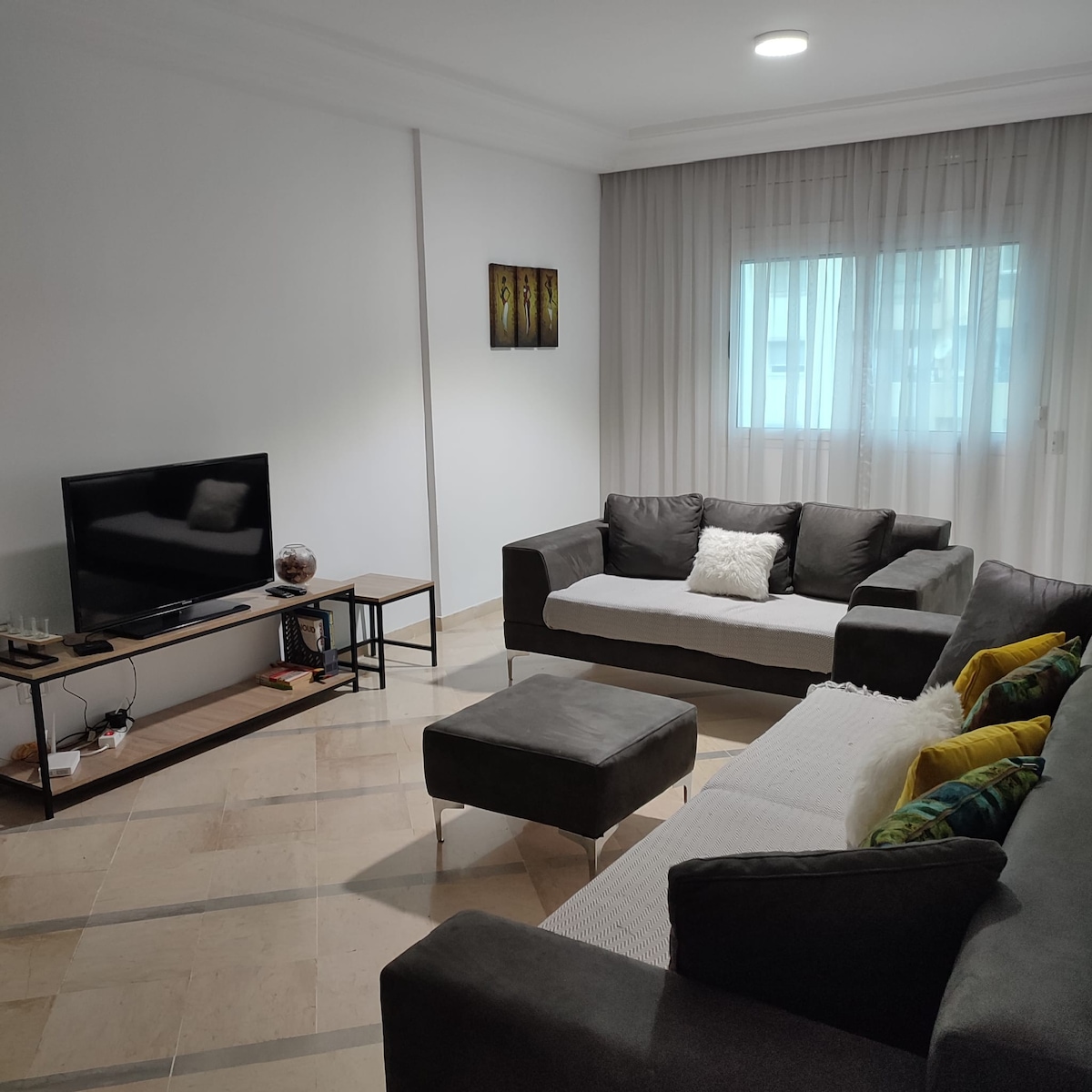 Appartement neuf, luxueux et parfaitement situé à Ennasr, dans une résidence moderne et sécurisée juste derrière clinique Amilcar. Profitez d’un salon lumineux avec grande TV, IPTV/Netflix et coin repas raffiné. La chambre offre un lit premium, de beaux rangements et une seconde TV. Cuisine moderne entièrement équipée, salle de bain élégante façon marbre. Fibre haut débit, clim dans chaque pièce, électroménagers neufs et parking privé. Un cadre chic et confortable pour un séjour inoubliable.