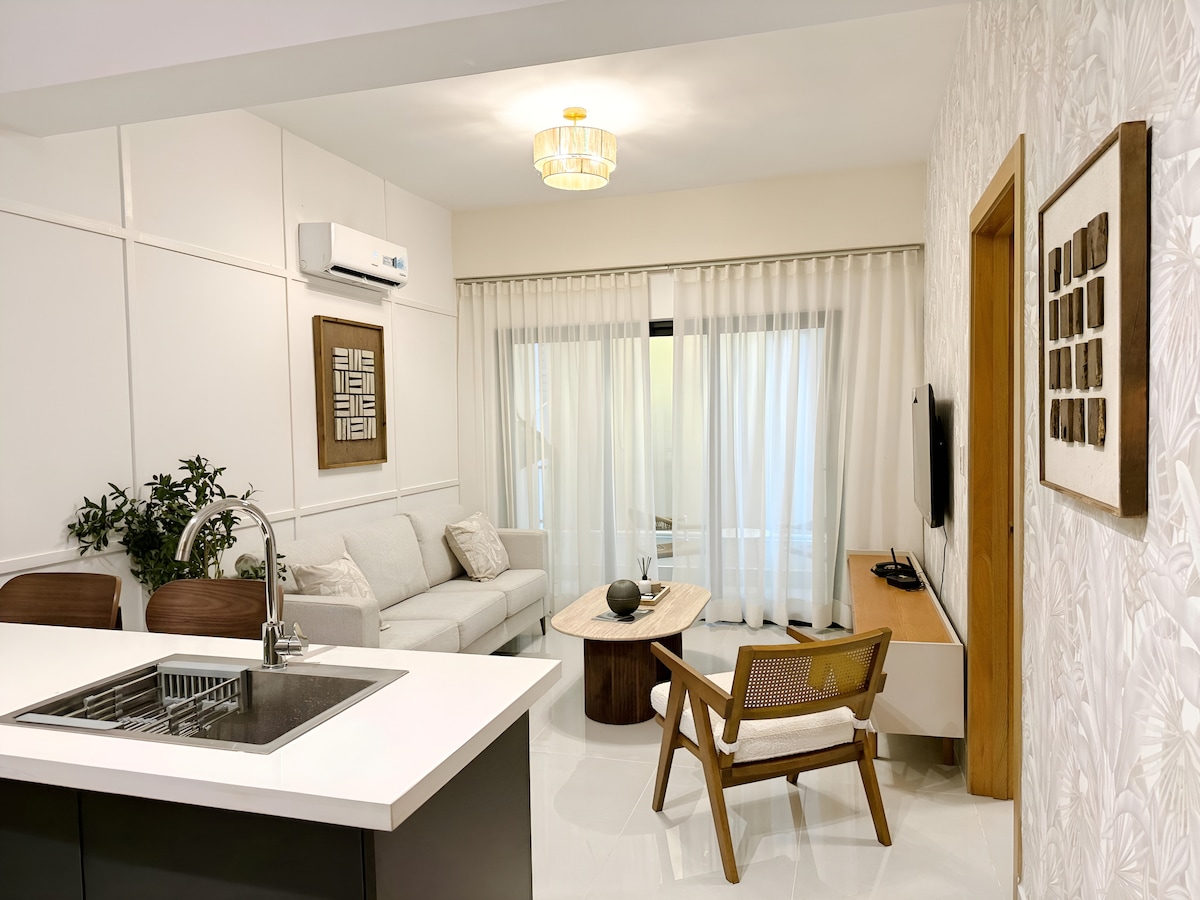 Spacious 1-bedroom apartment with private full bathroom, 2 air conditioner, walk-in closet, and extra storage closet. Includes a second full bathroom, fully equipped kitchen, and modern furniture. Enjoy stunning city and ocean views. Building features infinity pool, jacuzzi, gym, movie theater, rooftop lounge, pool table, ping pong, and dominoes table. Ideal for comfort, luxury, and a premium stay in Santo Domingo.