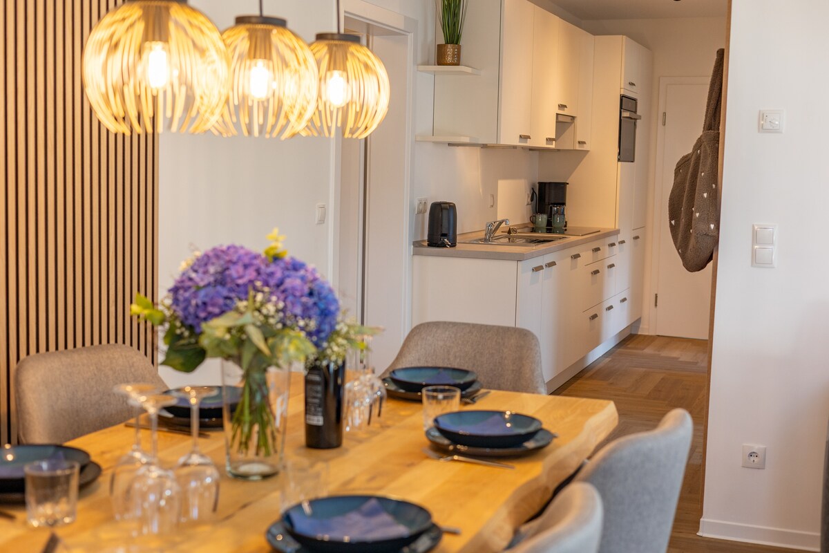 The 100qm Apartment can accommodate up to 6 people, designed to create a relaxed & homely ambience. It consists of 3 bedrooms, 2 with 180x200m kingsize Boxspring beds & one with a comfortable 200x200m bed. It features a guest WC, bathroom with a bathtub, shower & toilet. The open living & dinning room with a balcony view in the nature can serve as a perfect area for working remotely. There’s a fully equipped kitchen with a dishwasher.