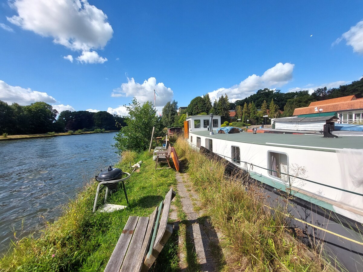 Genieten op een schip in een prachtige groene en rustige omgeving. met je eigen tuin aan het water. volledige privacy en stilte . Het schip is mijn eigen huis maar bij een boeking ga ik op vakantie. Ik deel graag de unieke plek en ervaring met iedereen . ik heb eventueel 3 fietsen te leen waarmee je de prachtige bosrijke omgeving en coulissen landschap mag gaan ontdekken. ook weet ik nog een paar heerlijke zwemplezier die ik graag met u deel