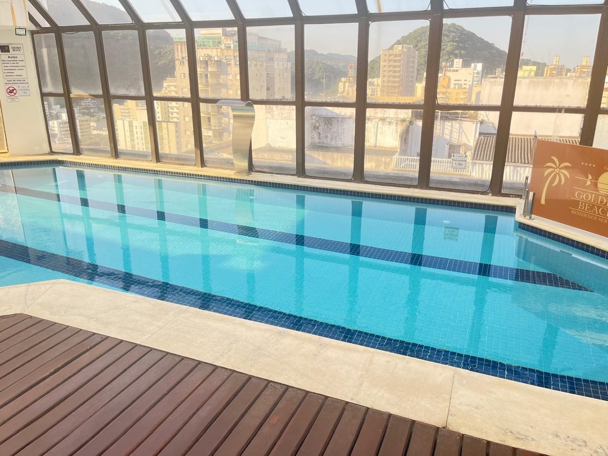 2 Quartos sendo 1 com suíte. Colado na praia de Pitangueiras, uma das mais lindas do Guarujá, a uma quadra da praia, no coração do Centro. Perto: restaurantes, galerias, sorveterias, cafeterias, McDonald's, BurguerKing, farmácia, SmartFit e na mesma rua o Shopping La Plage. O flat possui: Piscina coberta aquecida, academia, sauna quente e fria, café da manhã(à parte)arrumação diária, mesa de sinuca, ping pong, pebolim, playground, quadra de squash e serviço de praia.