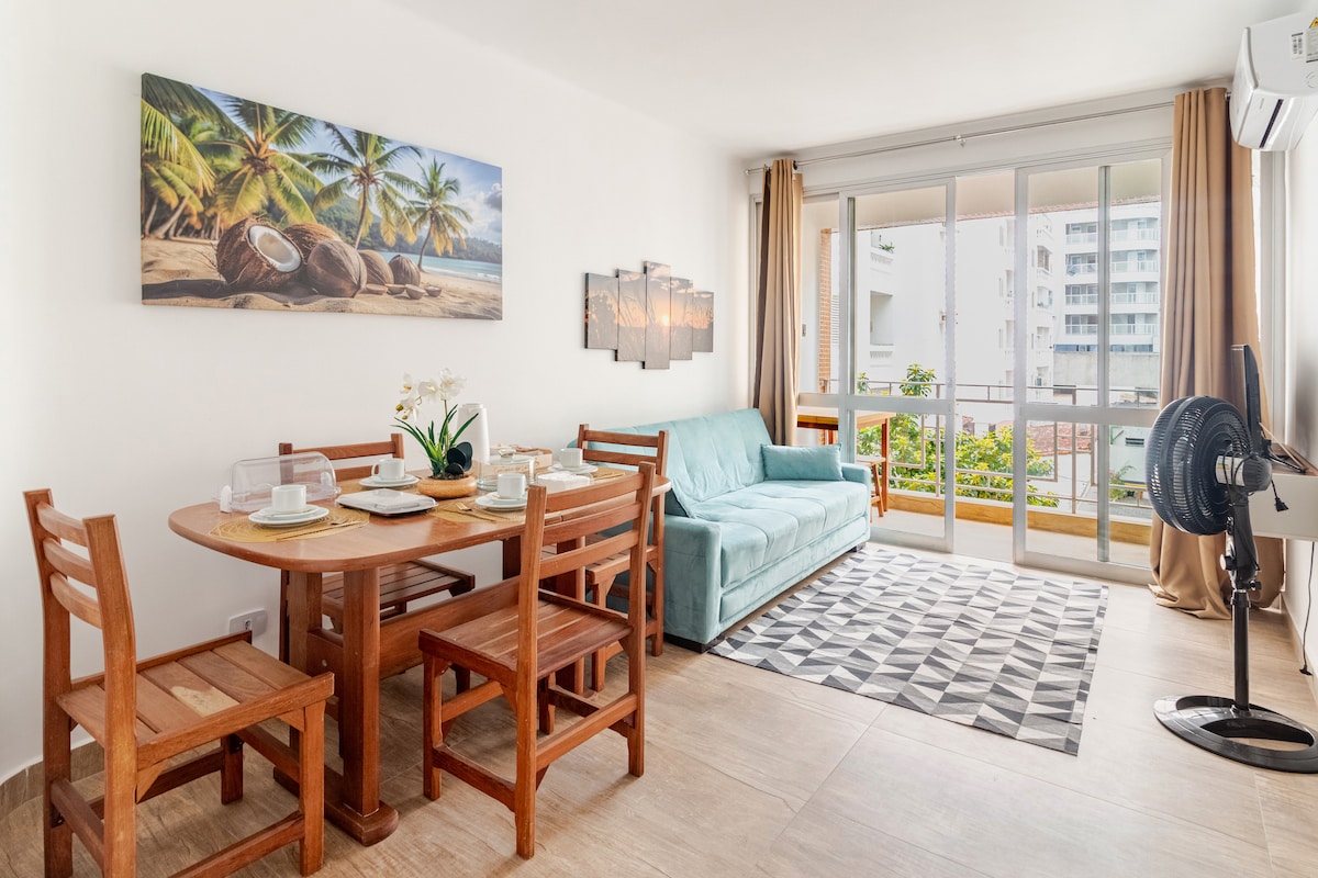 Apto super aconchegante só 4 minutos a pé até a praia (270m). É cuidadosamente limpo, organizado, ar condicionado em todos cômodos. O prédio é residencial, perto de supermercados, restaurantes, farmácias e outros serviços. São 2 quartos, sala em dois ambientes, TV smart, varanda, cozinha, lavanderia e 2 banheiros. Oferece Internet, 1 vaga de garagem, acesso à piscina, salão de jogos, máquina de gelo e serviço de praia. OBS: a piscina ou outro serviço podem estar indisponíveis para manutenção.