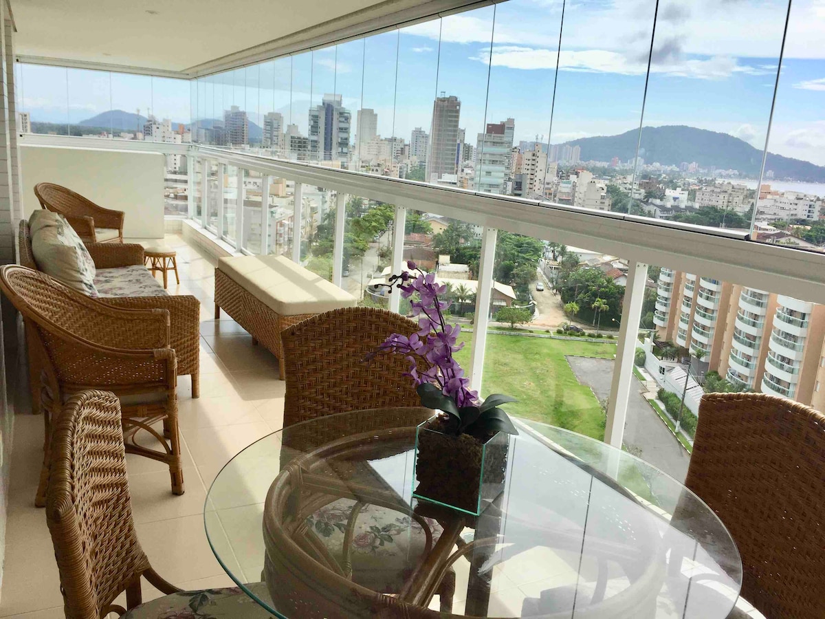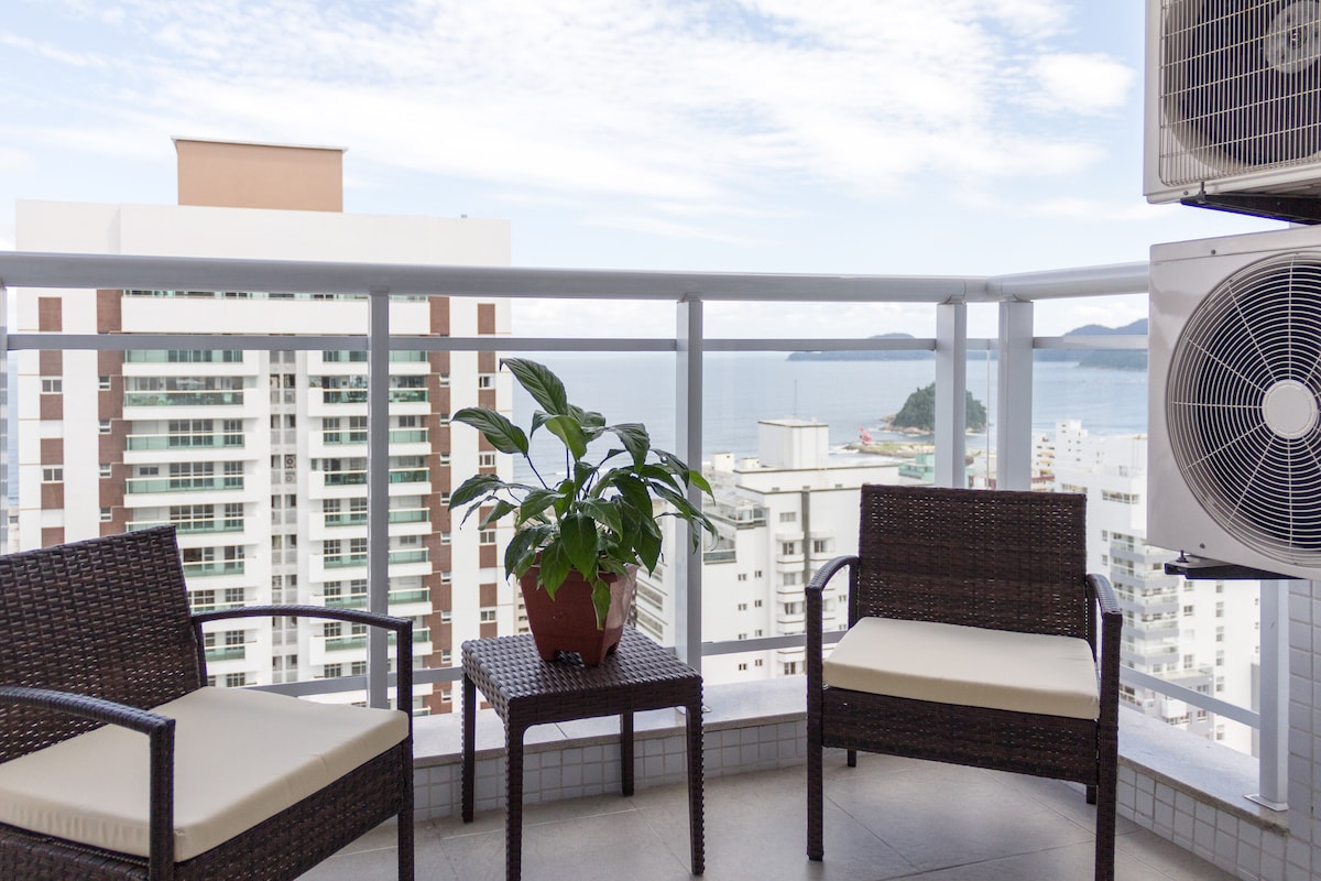 Parcele com Airbnb, em até 6x sem juros. Opção de Early checkin as 9 hs ou late checkout às 18 horas, basta levar lençol e toalha de banho. Temos travesseiros, mantas e capas de colchão. São 4 minutos a pé até a praia. São 2 vagas de garagens,com vista para o mar é completa com (piscina e churrasqueira privada) Rua tranquila e arborizada. Excelente localização com tudo o que precisar ao redor. Com mercados a 1 quadra, farmácia 4 q, bancos, fast foods 6 q, restaurantes 1 q, e 2 Smart Fit, teatro