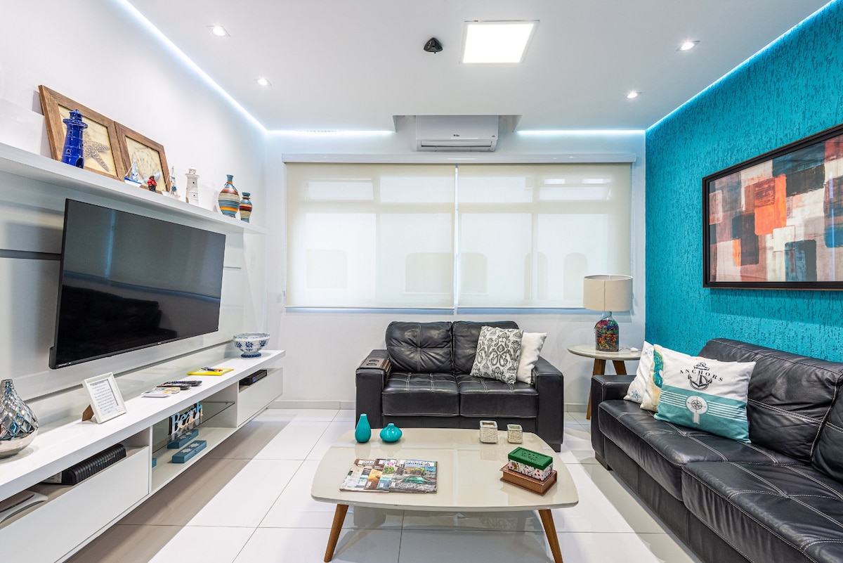 Enjoy the serenity of the seaside in this cozy apartment in Pitangueiras Guarujá. With stunning panoramic views it offers beach service, modern décor, new appliances and kitchenware, and a garage. Relax in the bright living room or on the balcony with the best ocean views. A fully equipped kitchen and a 55-inch smart TV are included. Whether for a family vacation or a romantic getaway this seaside retreat is the perfect choice. Book now and immerse yourself in the beauty of Guarujá's best beach.