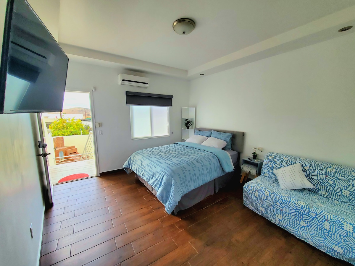 La suite está situada en la mejor ubicación de Ensenada, Baja California, frente al océano en un segundo piso de la casa principal.con entrada independiente Cuenta con una terraza privada donde podrán disfrutar de los atardeceres más espectaculares. Los huéspedes, bajo reservación, podrán disfrutar de la piscina climatizada y de la sala adyacente a la piscina.