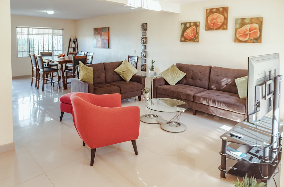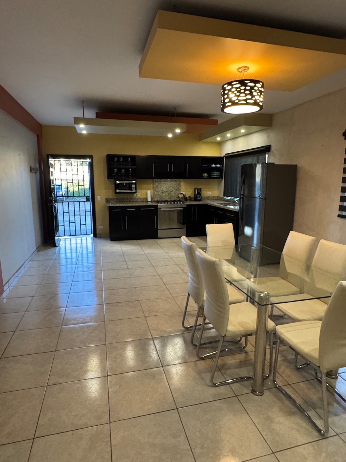 Casa muy amplia para 9 personas, amueblada con cochera privada y cerrada con portón eléctrico con capacidad para 2 carros. Zona tranquila y muy cercana a todo. Cuenta con WIFI, 3 TV, Lavadora, secadora, refrigerador, A/C, estufa, cafeteras, licuadora y horno de microondas, utensilios básicos de cocina, 3 habitaciones, 1 cama king size, 3 camas Queen size y 1 cama individual, Asadero y patio para reuniones. Entrada autónoma mediante caja de seguridad, 10 min bares, playa, malecón, centro.