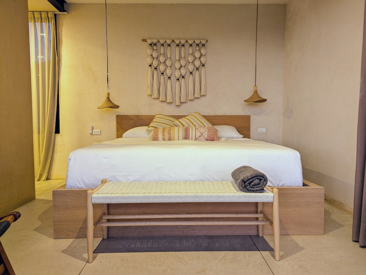 Te encantará la decoración elegante de este encantador lugar para hospedarte. disfruta de magicos atardeceres desde el jacuzzi en el balcon de tu habitacion, consta de una cama king size y un sillon de dia, cocineta, regadera de lluvia, tv con internet. Puedes obtener un fogatero de Gas en el balcón por 10 dlls, puedes agregar a tu mascota en la reserva, tiene costo adicional.