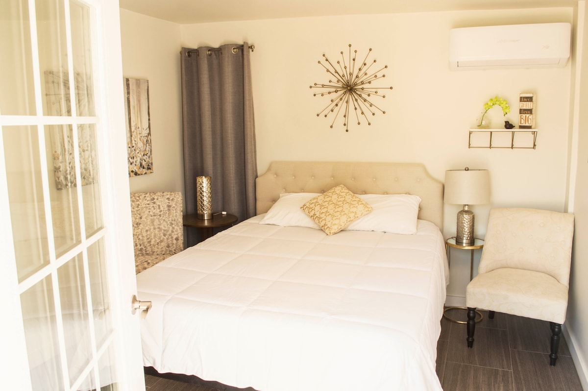 The Casita is ideally for a couple, it is quite a small place (180ft) It has a comfortable queen bed, shower with a restroom. It has a petite kitchen that includes utensils, mini fridge, microwave and a coffee machine. AC is definitely included!