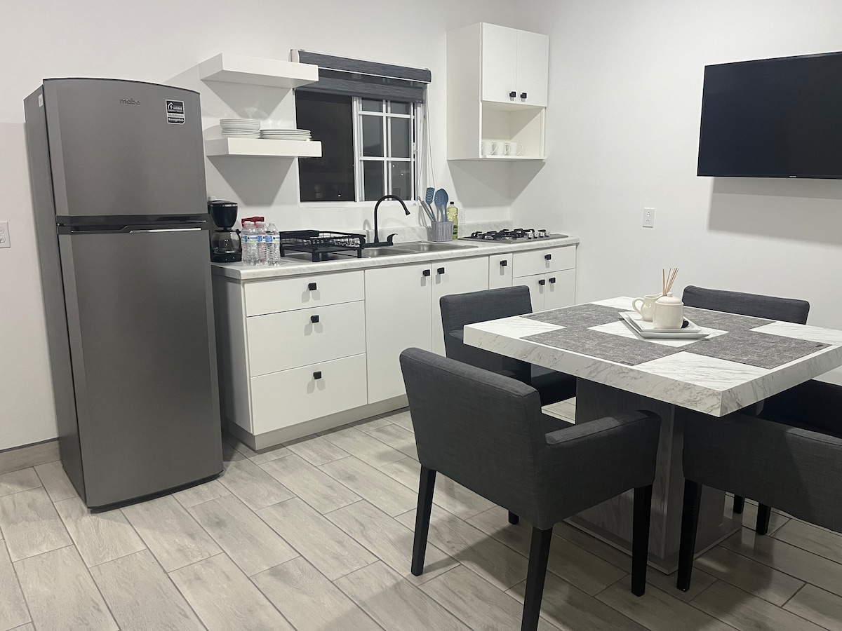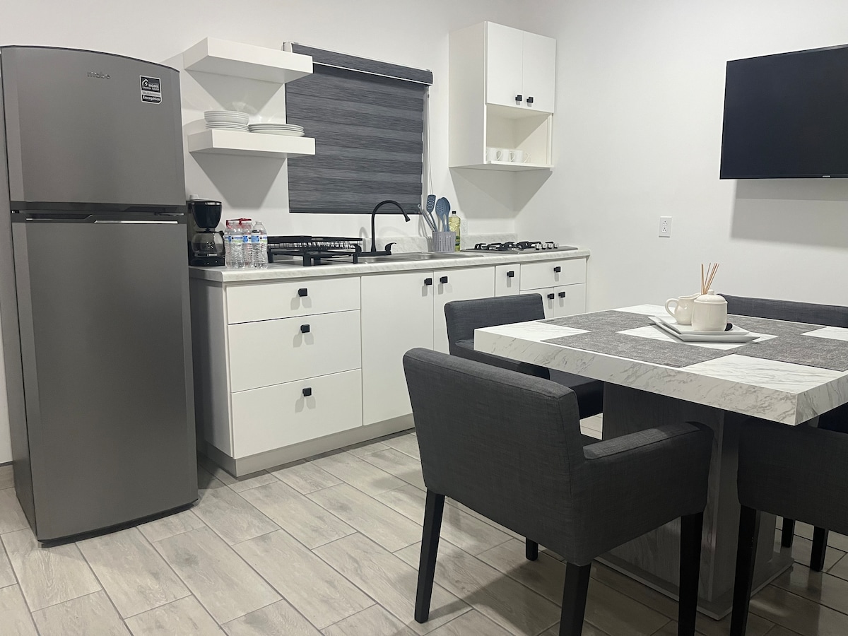 Welcome to our luxury and comfortable studio, designed to provide 5-star experiences for couples. With a King size bed, rain waterfall shower with perfect pressure and temperature, high-speed Wi-Fi, complementary coffee service, sofa-bed for kids, premium finishes and rotating TV, this studio is better than any hotel room or suite. This is a new unit that was finished in October of 2023, with everything out-of-the-box brand new. The stay includes private gated parking. Located at Casas Sanblu.