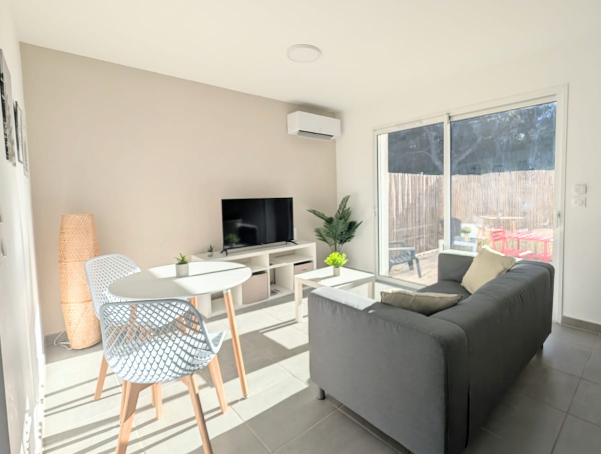 Dans un écrin de verdure à 2 minutes des calanques les plus belles de la région. Un T2 tout neuf de 40 m2, climatisé pour 4 adultes maximum avec accès piscine. L endroit idéal pour de belles vacances ou un weekend détente. Charmant et tranquille, vous profiterez du calme et de la sérénité de la colline environnante et des cigales l'été. Cet appartement totalement indépendant a tout le confort dont vous avez besoin.