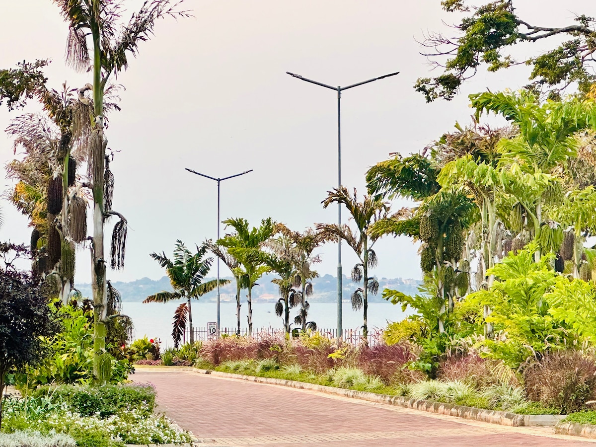 Perfect your gateaway at this spacious 1st-floor apartment with access to a private Lake Victoria beach. The apartment is a modern fully furnished and fully equipped family-friendly home. Stay connected with FREE 5G WiFi & a BACK-UP POWER INVERTER, the power will never go off which is excellent for remote workers. FREE PARKING, 24/7 SECURITY. 20 mins to Entebbe Airport, 40 mins to Kampala Central. Secured by the Pearl Marina Estate perimeter wall, only accessed by a 24/7 manned security gate.