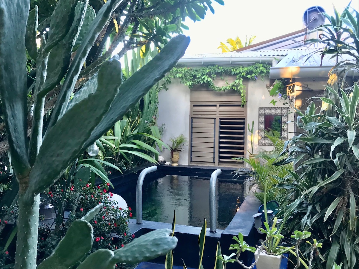 Studio version Tiny house tout équipé. Au milieu d’un petit jardin votre espace avec varangue et cuisine vous est réservé. Lit king size, draps et serviettes mis à disposition, climatisation, wifi performant, cuisine, piscine à disposition. Possibilité de place de parking sur place. A 10 mn en voiture du lagon de Saint Pierre et des principaux axes routiers qui mènent au Volcan, au cirque de Cilaos ou à tous les sites touristiques du sud sauvage. Commerces à proximités