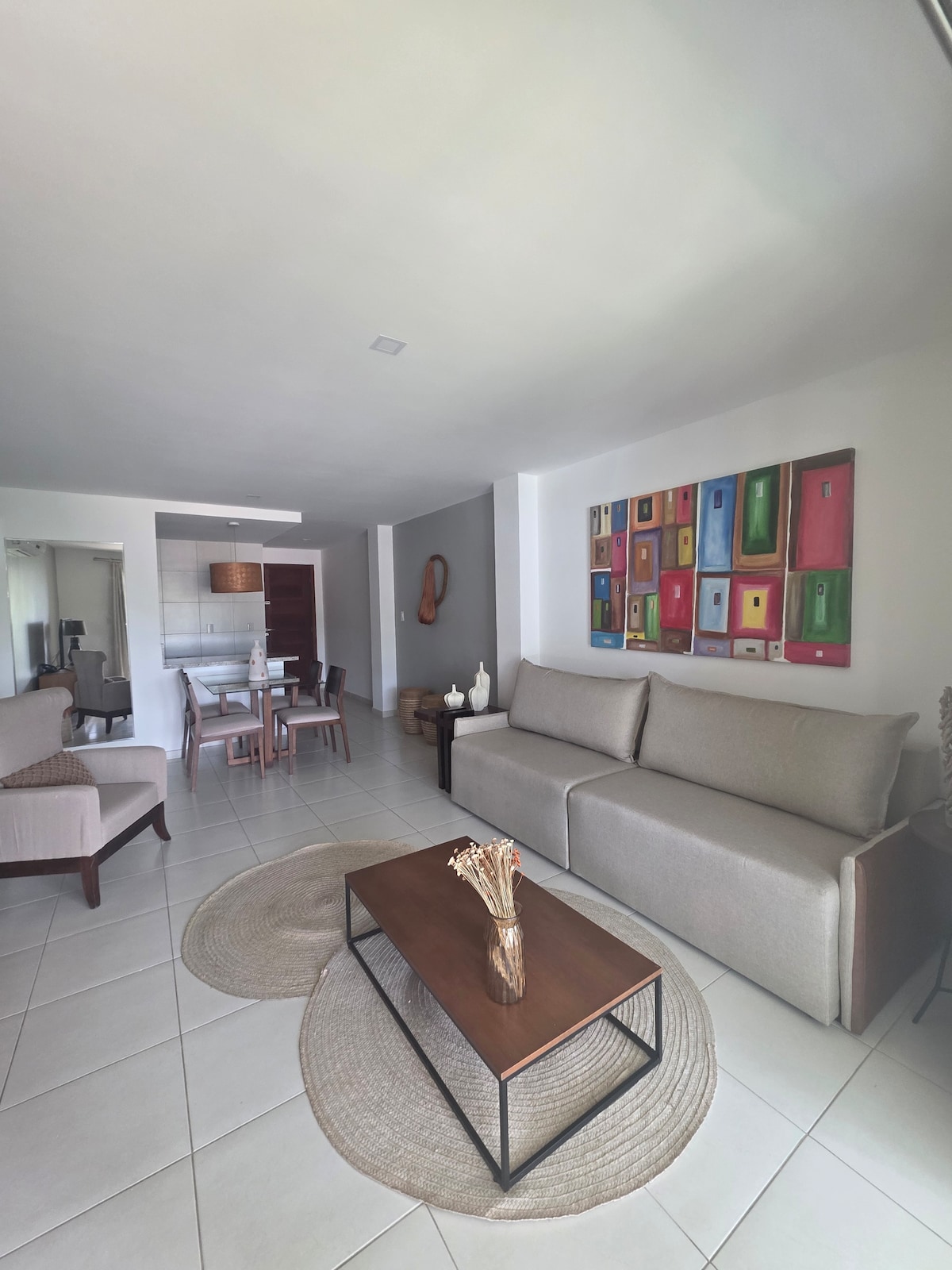 Olá, alugamos apto no Resort Reserva Imbassai, na linha verde, BA-099, km 65, - Complexo Grand Palladium Hotel. Sala ampla, 3 suítes , sendo 2 com varanda. Smart TV, ar cond., ventiladores, cozinha equipada, lavabo, área de serviço com maq. lavar. Condomínio com segurança patrimonial eletrônica por 24 horas; Club social com piscina, bar e restaurante, Praia com salva vidas, academia, quadras poli-esportivas, campo de futebol gramado, quadra de futvôlei.