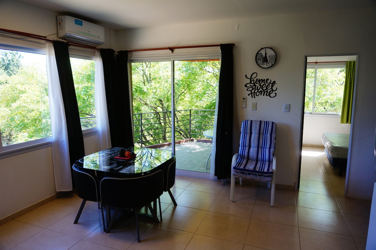 Edificio a 1700 m de la terminal de bus y a 1000 m de la plaza. Dpto. cómodo y luminoso. Decorado con personalidad será tu espacio seguro a muy pocas cuadras del río. La habitación cuenta con ventilador de techo y calefacción. El living comedor cuenta con 2 camas adicionales. Podrás utilizar la cocina y el comedor. A 5 min. del puerto. Estacionamiento gratuito en la calle. Zona segura. No tiene cochera. No tiene servicio de cable pero el TV tiene un cable HDMI para conectar a tu Notebook.