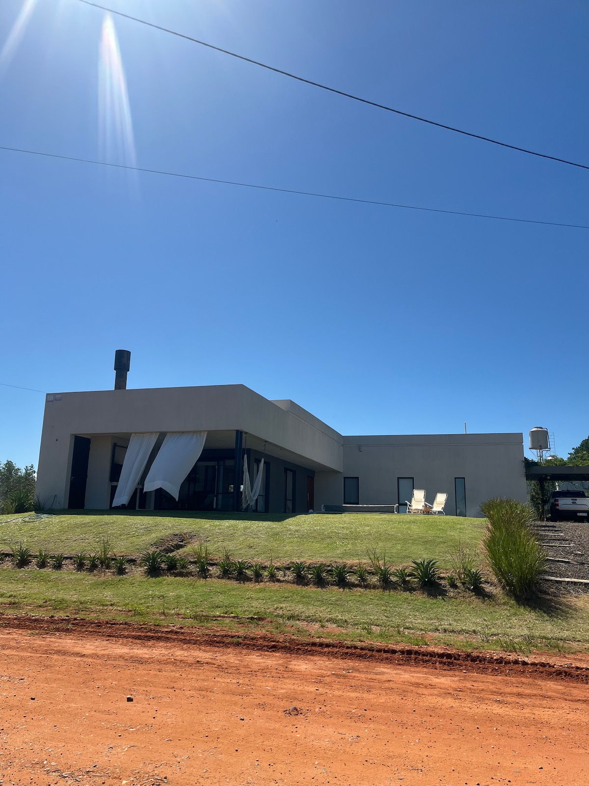 A farm in a 12ac land in a Private Neibourhood. A safe place in contact with nature. A simple house, warmy, luminous with great views of ondulating land & soft ravines. Sustainable farm only energised by Renouvable Energy (Solar panels,Eolic generator, Solar Heater and a Water wind Mill). For Nature & environment lovers. Several resting areas with hamacs under the shadow of trees, games for kids, ziplines, lagoons, fire zones, etc..
