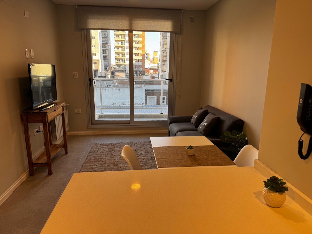 Ubicación estratégica. Departamento luminoso de 1 dormitorio, piso alto, con dos balcones y hermosas vistas al atardecer. Amenities (gimnasio, quincho, piscina, solarium y patio). Disfruta de una estancia cómoda y relajante, ideal para parejas, viajeros de negocios o visitantes que buscan tranquilidad y funcionalidad. El espacio cuenta con: Una habitación cómoda con cama matrimonial, mesa de luz y armario amplio. Cocina comedor equipada con todo lo necesario para preparar tus comidas favoritas.