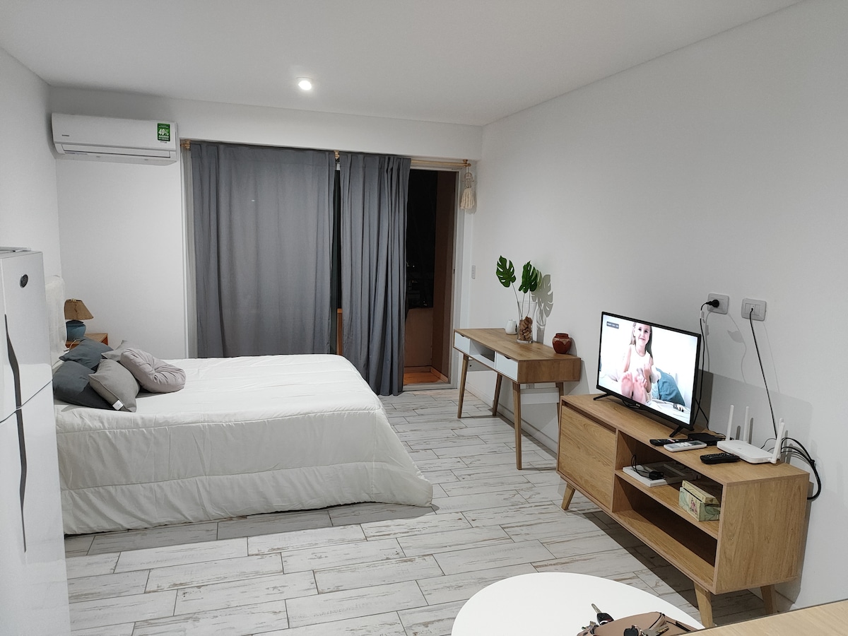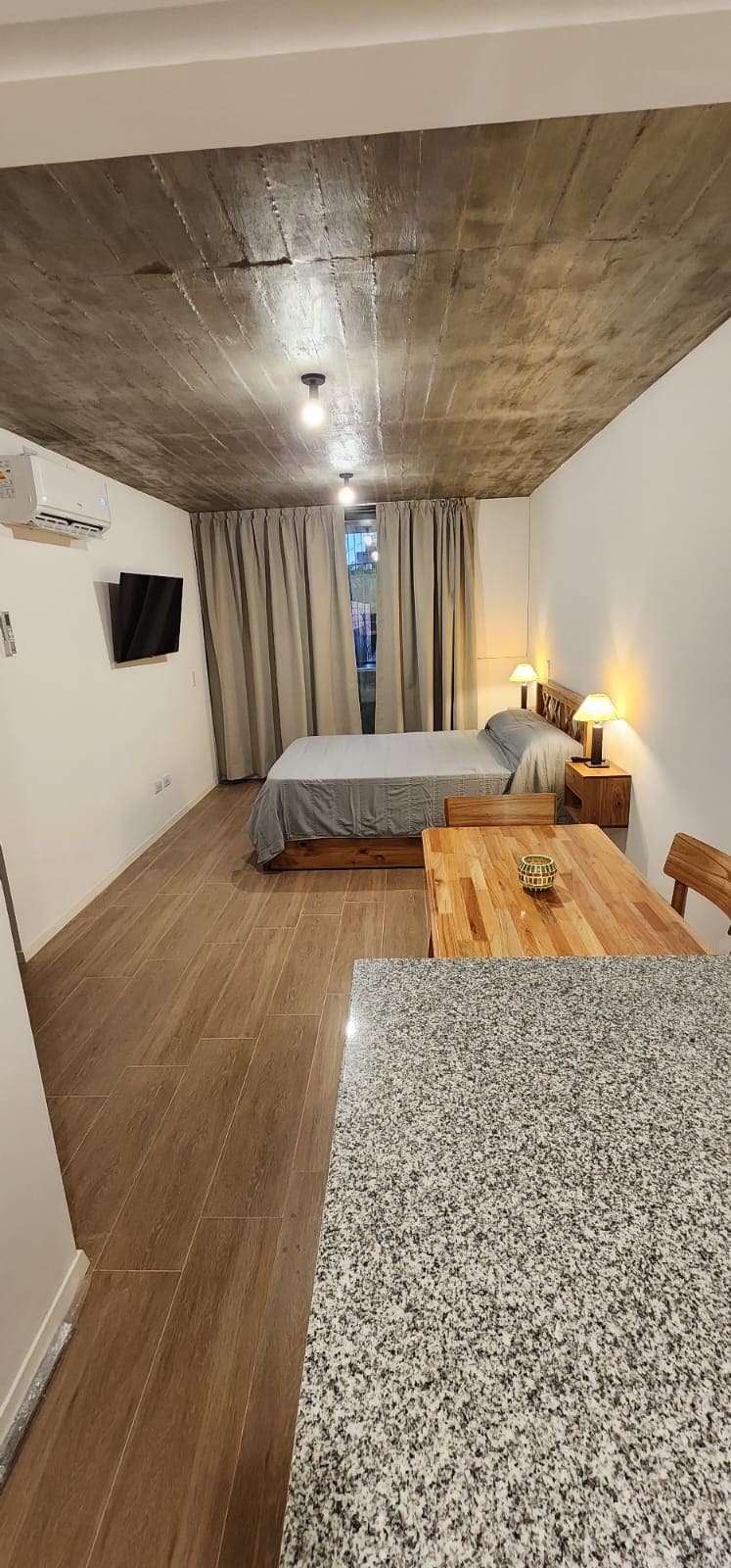 Monoambiente cálido y funcional, ideal para estancias largas. Luminoso, tranquilo y con balcón, cuenta con heladera, cocina equipada y mobiliario práctico para el uso diario. Funciona muy bien para estudiantes o personas que vienen por trabajo y buscan una estadía cómoda a buen precio.
