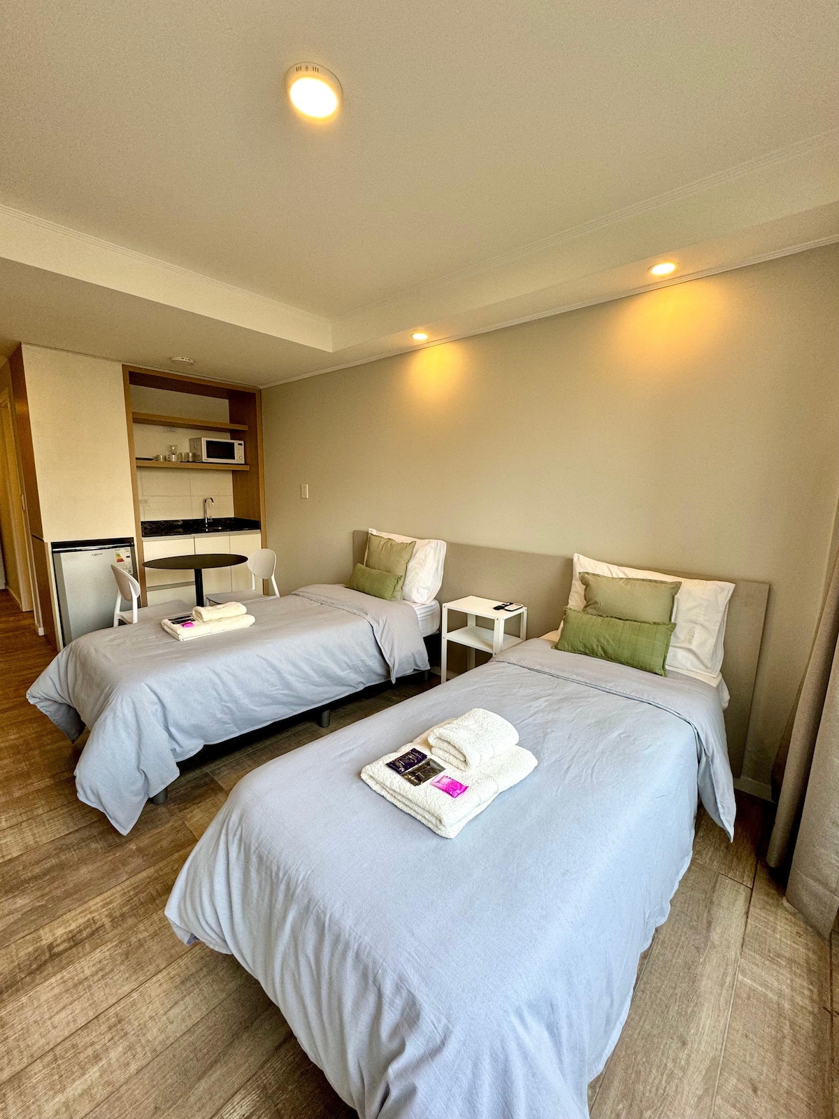 Bienvenido a nuestro acogedor apart hotel en el corazón de Paraná! Ubicado a solo cuatro cuadras de la plaza principal, te ofrecemos una experiencia cómoda y conveniente. Disfruta de una habitación con cama matrimonial, dos camas simples con marinera, y una kitchenette equipada con microondas, heladera, mesa, sillas y vajilla. Ideal para familias y amigos, nuestro espacio cuenta con WiFi gratuito, aire acondicionado y calefacción.