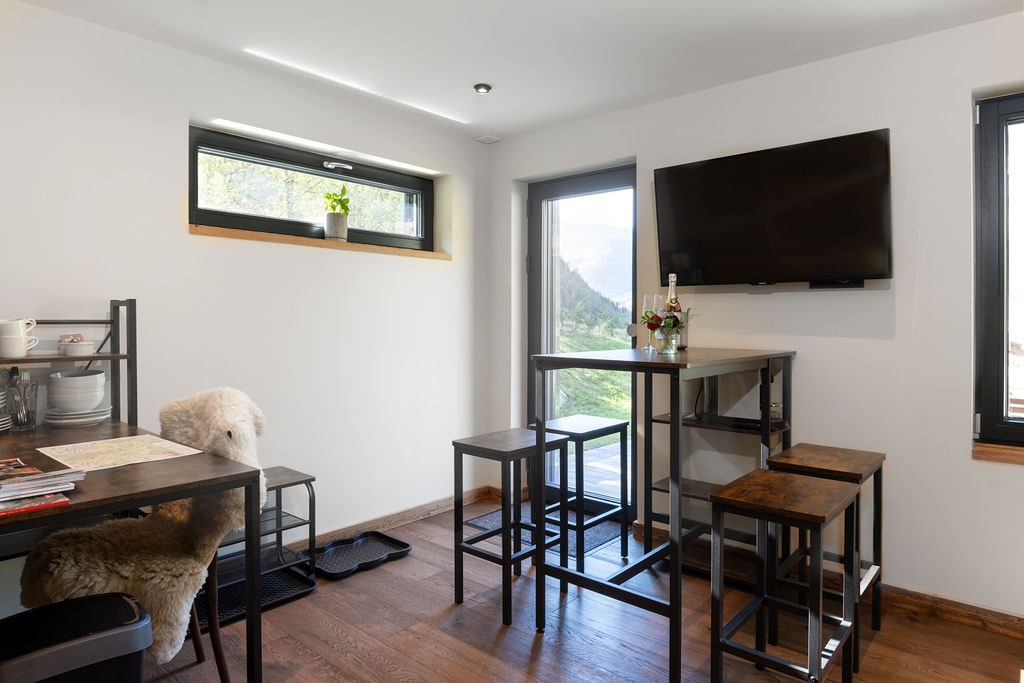 Rossignol-a charming one-bedroom apartment ideally located in a calm street in Verbier, yet just a couple minutes walking from Place Centrale and the free bus stop, which will conveniently take you up/down to Medran. This delightful space features an open-plan kitchen, a cozy living room with a convertible sofa, and a balcony offering mountain views. Enjoy the comfort of a king-size bed, a bathroom with a bathtub, and the convenience of a ski locker.