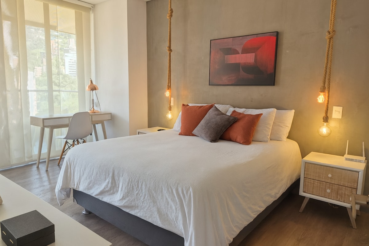 RECENTLY RENOVATED -High-speed internet great for remote work -Brand new A/C -Fully renovated Industrial design apartment -King size bed -Breathtaking views of Medellín (trust me, worthwhile to stay here) -19th floor -Unbeatable location in Poblado near to Provenza and Lleras Park -Modern amenities -Spacious living area -Smart TV x 2 -Fully equipped kitchen -Washer & Dryer Tower -Pool -Gym -Coworking space -Restaurant inside the building -Private parking -Self check-in -24/7 Security
