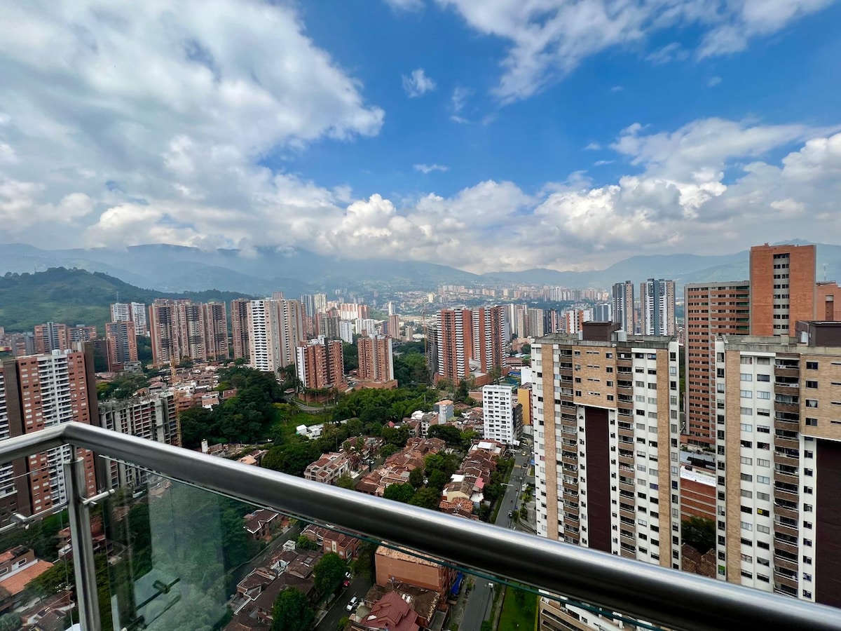 Apartamento ubicado en el piso quince, en uno de los mejores sectores de la ciudad de Medellín, con una vista es excepcional. Cuenta con 2 alcobas con aire acondicionado, 2 baños completos y un balcón donde podrás disfrutar de la vista. Todas las cortinas son automáticas con un toque moderno, 3 televisores, lavadora y cocina bien equipada y lavavajillas, cuenta con 3 parqueaderos cubiertos gratis. En la terraza encontraras una piscina donde podrás relajarte y disfrutar el paisaje. Gimnasio.