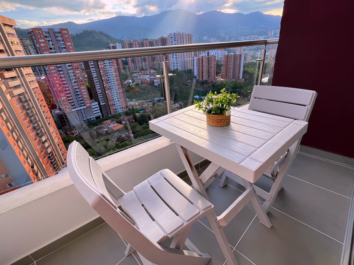 **IMPORTANT! READ HOUSE RULES FIRST** Stunning 20th-floor modern apartment with panoramic city skyline views. This 2-bed retreat sleeps 4 and features a private balcony, dedicated workspace, and fast Wi-Fi. Enjoy resort-style amenities including a rooftop jacuzzi, gym, and sauna. Perfectly located opposite the Viva Envigado shopping center for ultimate convenience. Ideal for families, couples, or business travelers seeking luxury and comfort.