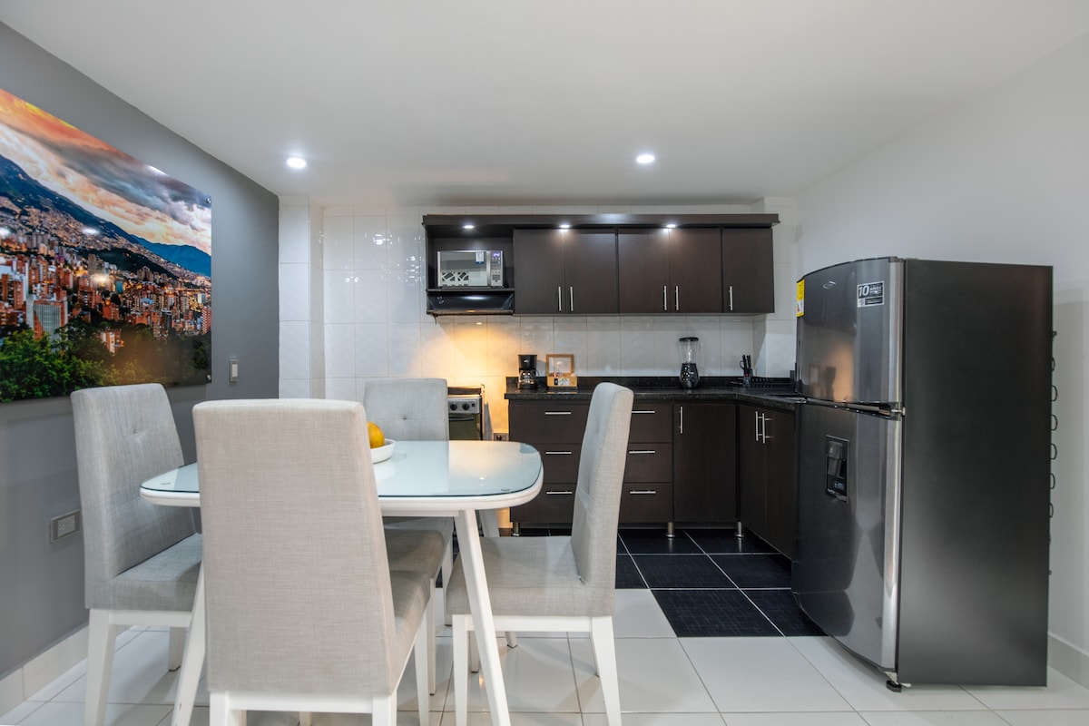 300Mbps FO Wifi. Free Guest. Special place close to everything, making it easy to plan your visit. Fully furnished suite with air conditioning, kitchenette (ice maker, coffee maker, sandwich maker, blender, mini fridge, electric stove, microwave), Work Station with monitor, PS4 (COD, Madden, NFS), Lounge/working area, Gym, Laundry room, and an amazing view. Located in one of the best areas of Medellin, close to all places of interest (Santa Fe Mall, EAFIT, Metro, Parque Lleras, Provenza).