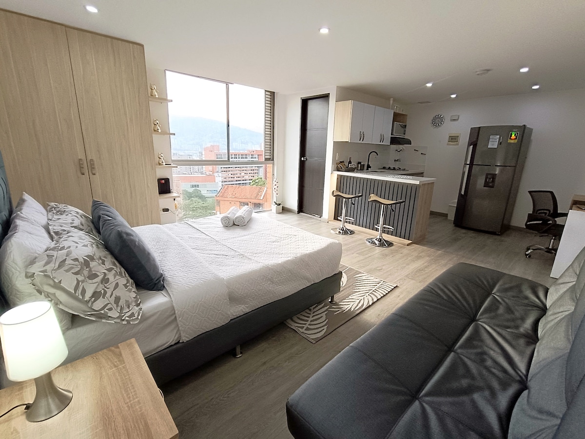 Suite completamente amoblada de 28 m2, con aire acondicionado y cocineta. Ubicada en una de las mejores zonas de Medellín, en un barrio muy tranquilo y cerca de todos los sitos de interés. La Suite cuenta con una vista espectacular a la ciudad y a las montañas. Podrás hacer uso de la zona de coworking, gimnasio y un espectacular café que ofrece diferentes tipos de bebidas a base del mejor café colombiano, podrás disfrutar de tu bebida en la terraza que se encuentran en el 2do piso del edificio.