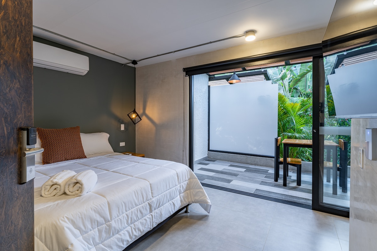 • Amazing location in heart of Poblado: "Oasis in the middle of the best part of the city, walking distance to everything” • Modern, comfortable fully furnished Loft • High speed 200 Mb WiFi Fiber Optic • Loads of nature around • Private outdoor patio • A/C • Pool + Hot Tub in common areas • 5 mins walk to best restaurants, cafes, malls. 22 mins walk to Poblado and Lleras Park • Fully stocked kitchen • 43" Smart TV w/ all Apps • Transparent prices: No service or cleaning fee • On site 24/7 staff