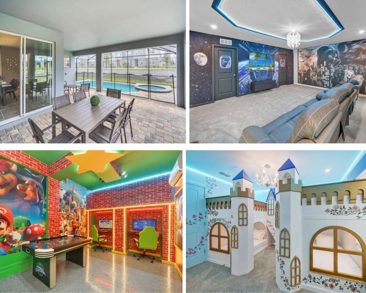 Welcome to our newly remodeled 4BR/4BA luxury villa in Reunion, designed for families and groups seeking comfort, style, and a magical Orlando escape. Enjoy brand-new furnishings, modern finishes, Toy Story and Mickey themed bedrooms, a spacious open living area with massage chair, and a fully equipped game room featuring air hockey, arcade basketball, and PlayStation. Relax in your private screened pool with optional heating after unforgettable park days.
