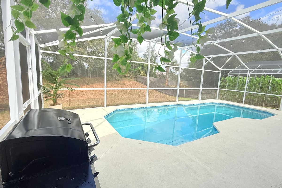SUN SUN SUN. All day sun with our Private LARGE sun deck. Newly added golf putt putt. Also Cornhole 🎉 Complimentary welcome snack basket with sweet & salty treats included with every stay. Hot Tub, Private pool , fully fenced large yard . A game room with pool table, darts, arcade game and just added , an electronic pinball machine , there’s also a retro record player. 4 miles to Disney. Disney themed, king bed, queen bed and twins, large fenced yard for dogs