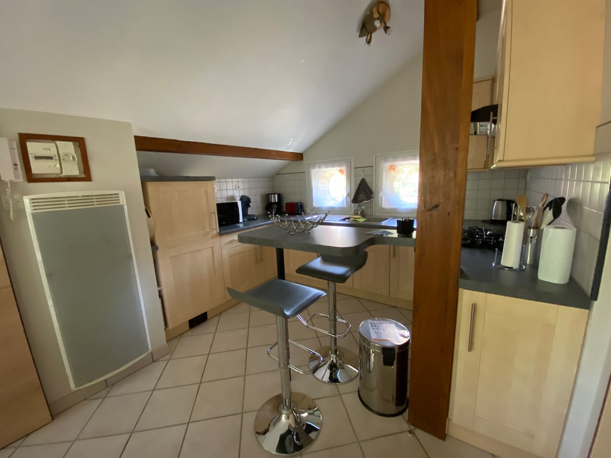 Logement parfait pour les familles ou les petits groupes d'amis, pour un couple ou solo. 1 lit de 2 personnes dans une chambre privée et 1 canapé lit 2 places dans la pièce à vivre. Entrée indépendante, grande pièce à vivre avec cuisine équipée (lave linge, lave vaisselle, micro-ondes, four, plaques vitrocéramiques, ...) télévision, WIFI. Salle de Bains (toilettes, lavabo, douche à l'italienne). Chauffage électrique, isolation refaite à neuf. Très grande terrasse en angle. Possibilité barbecue.