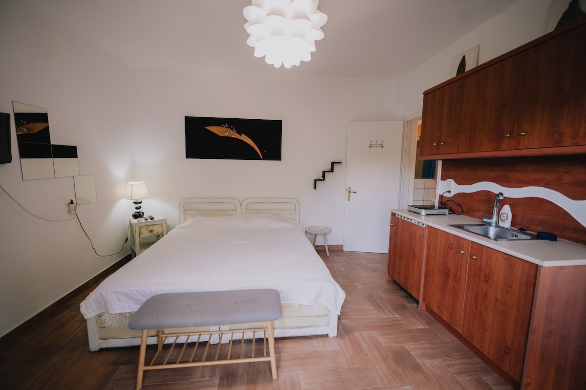 A studio apartment with a view of the Ionian Sea, just 2 km from the historic centre of Preveza. The apartment features a large double bed, a sofa bed (sleeping area 130*190 cm), and a fully equipped kitchen. The seaside area of Pantokratoras is one of the most beautiful neighborhoods in Preveza, with a lovely beach right below the apartment, as well as several others within less than 1 km. It can also be combined with the Ionian Blue Apartment.