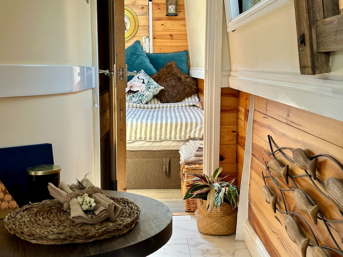 Detached chalet luxuriously appointed with smart TV with Netflix .silent ,good sized fridge, kettle ,toaster microwave,iron and board) comfortable king size bed with large bedside tables with plenty of clothes storage, and hanging space.there is a small table with chairs stored under the bed,so can be used for meals or a work space.we have a newly refurbished bathroom,with massive walk in shower..there is outdoor table and chairs to enjoy the afternoon sunshine.