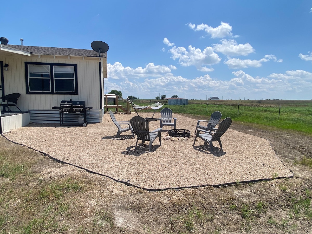 Enjoy this new Tiny home on a private 10 acre parcel just minutes from I-20. Strawn TX is an hour from Ft. Worth, less than 2 hrs. from Dallas. This setting embodies the charm of west Texas: picturesque rural landscape, rolling hills, open fields, and patches of trees. Experience the quintessential rural Texan countryside, with its wide-open spaces and a sense of tranquility. Roast marshmallows over your firepit, enjoy beautiful sunsets, and relax in the quiet beauty.