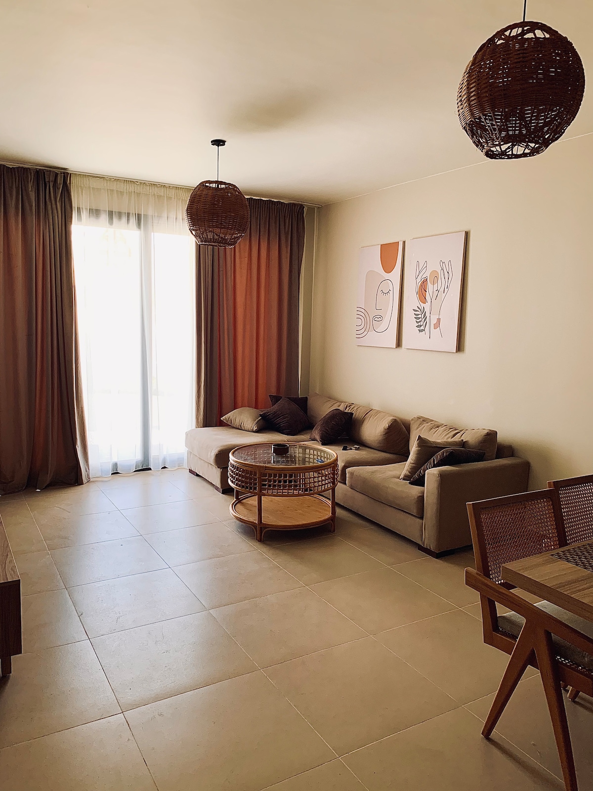 Kick back and relax in this calm, beautifully maintained, two bedroom two bath corner unit in the heart of Ain Sokhna. Completely renovated Wabi-Sabi style home welcomes you with its unique rooms, stunning kitchen, and amazing entertaining spaces immersed with natural light. The view is precious overlooking beautifull swimable crystal lagoons, along with a self-healing green area. Conveniently located close to Cairo Governorate, and about 10 mins from Ain Sokhna gates. “A One-Hour Ride”.