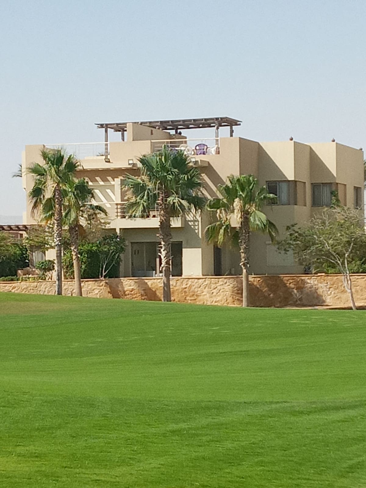 Relax with the whole family at this peaceful place to stay. It is 3 bedrooms first floor chalet. The chalet is fully air conditioned with amenities including a fully equiped open kitchen, smart TV, living area, balkony and a roof with dining area and BBQ, on spacious golf garden. The flat is walkable to adult pool and shaded kids pool. 4 minutes by car to Jazz hotel and large sandy beach.