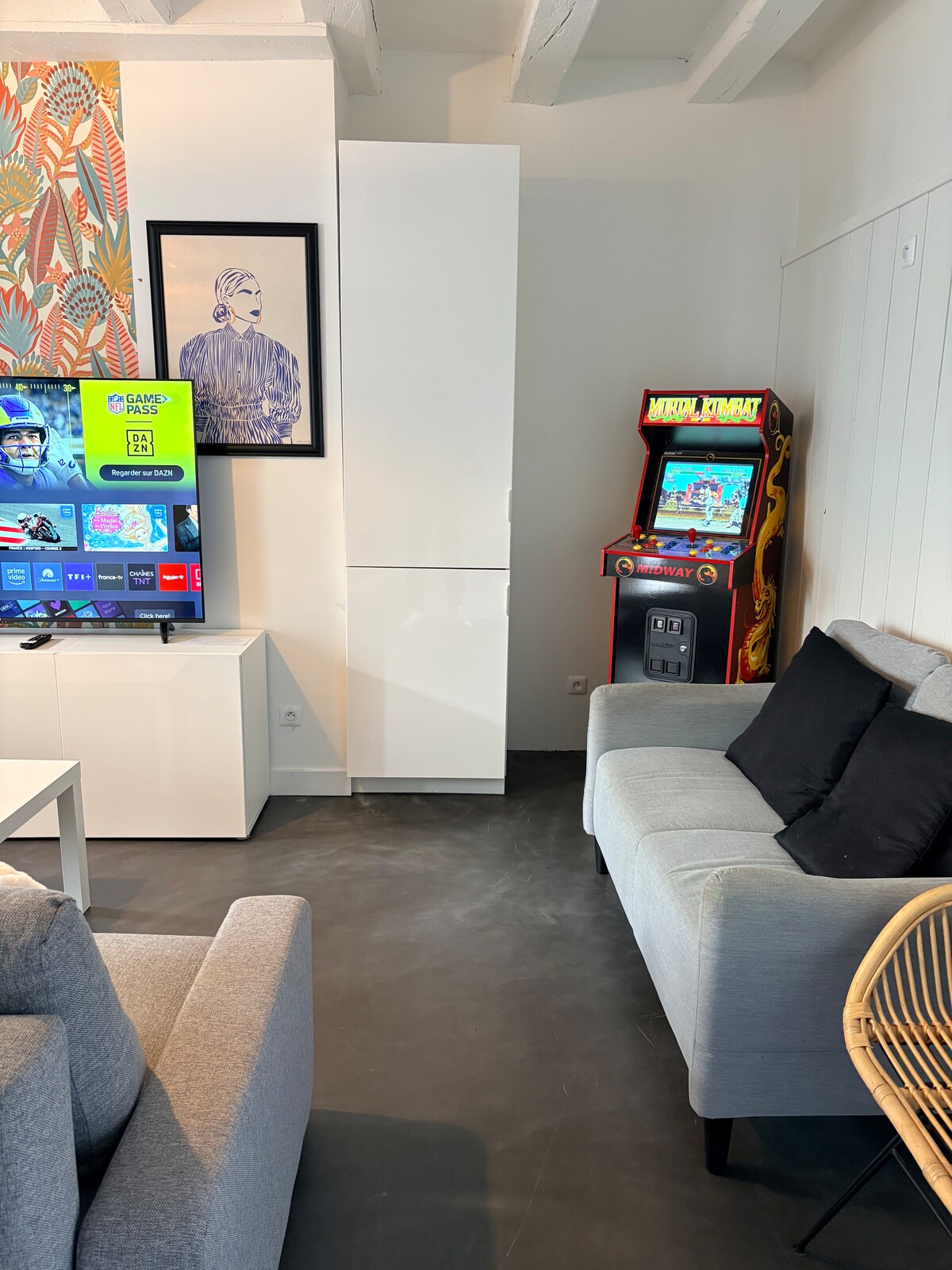 Profitez d'1 "Appartement Galerie d'Art" dans le style élégant Pop Art année 60/70, à Trentemoult village atypique et touristique à REZE-NANTES A 150 mètres de la Loire, à 2 pas de Nantes, idéalement situé pour découvrir le Voyage à Nantes, les Machines et L'Eléphant, les Anneaux de Buren, le passage Pommeraye, le Château des Ducs de Bretagne, Royal de Luxe; Venez profiter d'1 espace de détente lors de votre séjour de travail ou de loisirs Idéal pour découvrir Pornic, St Brévin, La Baule