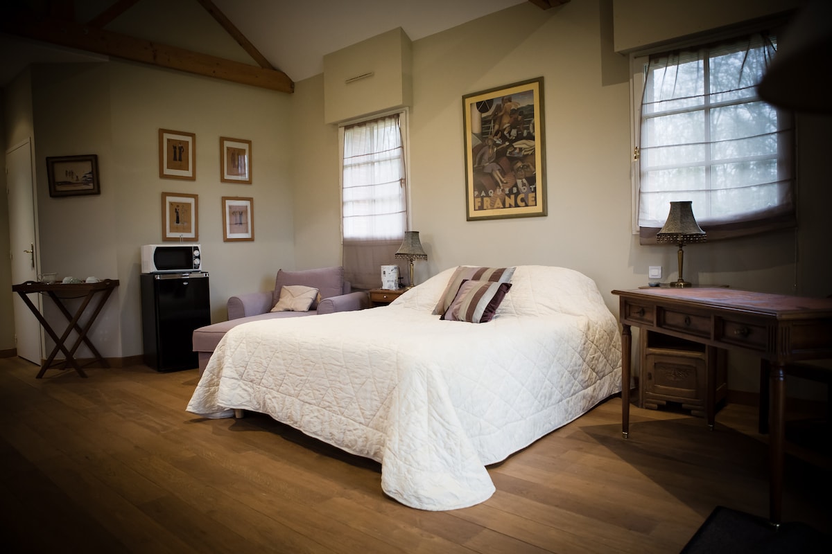 Grande chambre individuelle avec accès indépendant dans le parc d'un château romantique. La chambre est décorée Art Déco années 1930 Bureau, frigo et micro ondes dans la chambre ainsi qu'un plateau de courtoisie avec thé et café Proche du Puy du Fou