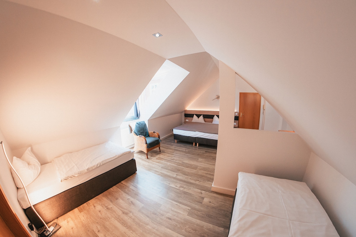 Unser Familienappartement verfügt über ein Elternschlafzimmer, ein Kinderschlafzimmer und einen abgetrennten Wohnbereich. Das Elternschlafzimmer verfügt über ein großes Kingsize Bett. Durch die Glastür gelangt man in das Kinderschlafzimmer, welches mit einen Etagenbett und einem kleinen Spielbereich ausgestattet ist. Der separate Wohnbereich verfügt über einen Schreibtisch mit Fernseher und ein ausziehbares Sofa, auf welchem weiteren 1-2 Besucher Platz finden können.