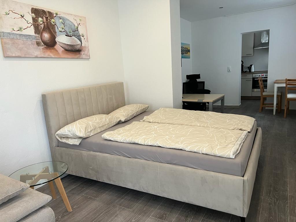 Das Appartement hat einen eigenen Eingang. Über den Treppenabgang kommt man ins Souterrain mit Vorraum und Garderobe. Im ersten Raum befindet sich die Wohnküche mit Sitzcouch und Tisch, Küchenzeile und TV. Durch einen offenen Durchgang kommt man in das Schlafzimmer mit Kleiderschrank, Bett 1,40 cm breit und Schreibtisch. Im Anschluss befindet sich die Schiebetür zur Dusche mit WC.