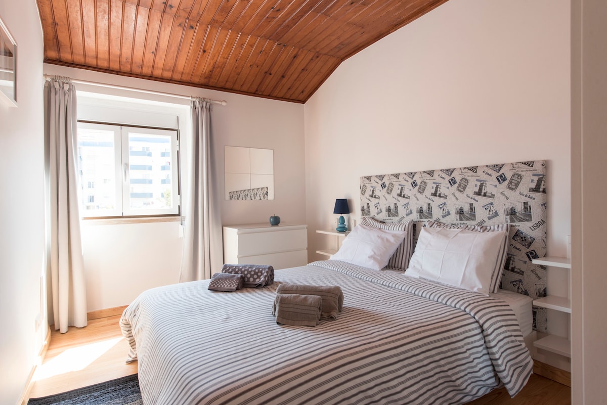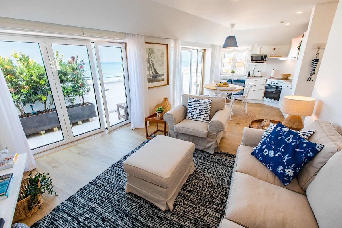 Apartamento reconstruído por arquitecto, excelente privacidade, exposição solar, com wifi, e praia a 150m. 1 suite com SPA e banho turco com aromaterapia. 1 suíte com terraço com vista mar, tela de projeção de cinema. Sala com vista de mar, rio, e terraço, onde poderá disfrutar de uma zona de estar e de um barbecue com grelha em ferro forjado. Perto de restaurantes, cafés e supermercado, e estação de comboio. Ar condicionado e piso aquecido em todas as áreas, TV 4K e box independente por suíte.