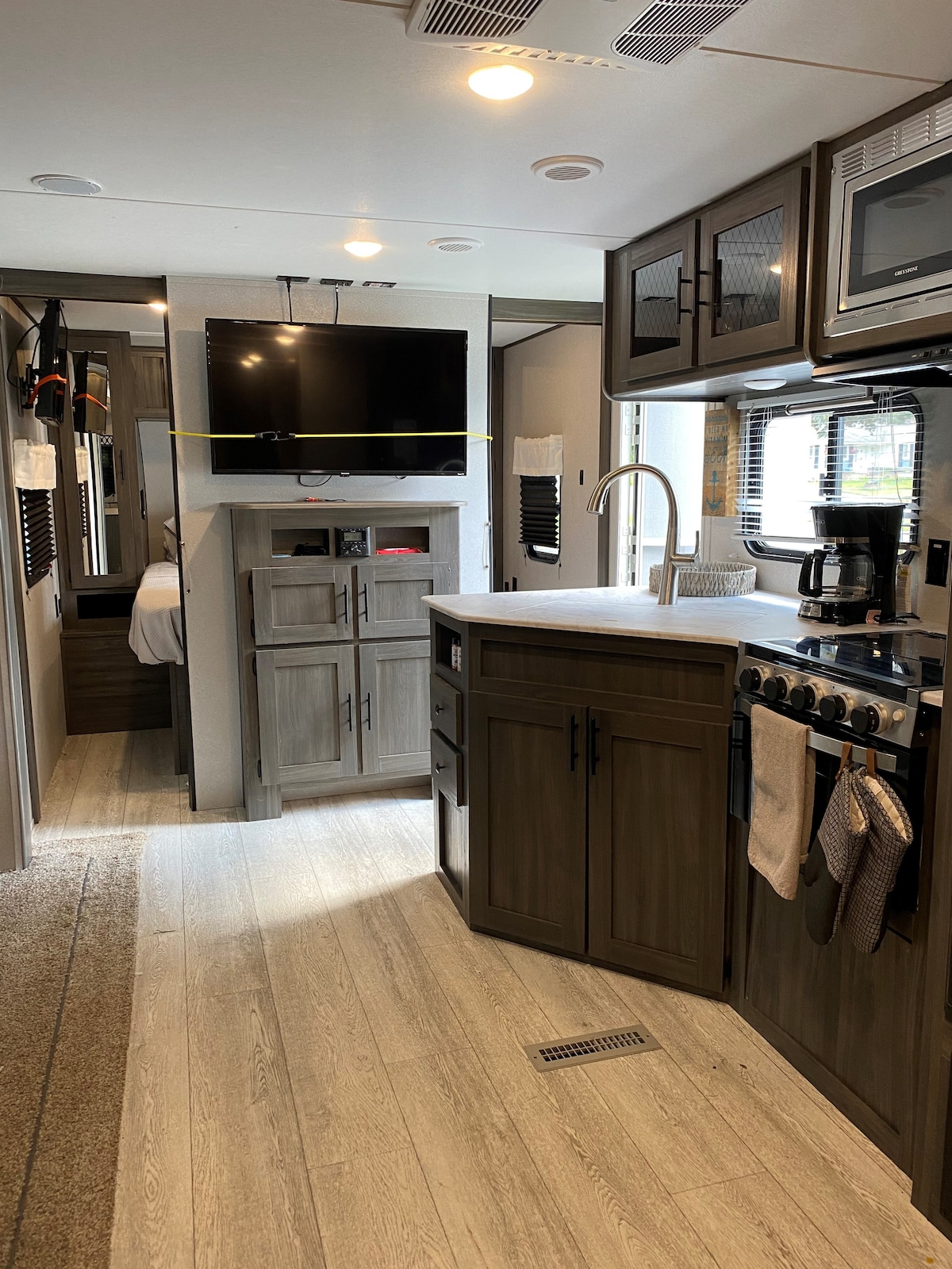 2020 Coachman Catalina Legacy edition with large slide out and bunk house. Sleeps 10 people. Front Queen Bedroom, Mirrored Shirt Wardrobes, Overhead Storage Cabinets. Wall-Mount TV, Fireplace, and Storage Cabinets! Sofa/Bed and Booth Dinette with Bench Seat . Full Bath with Mirror Cabinet, and Shower Skylight. Rear 2nd Bedroom Bunkhouse with 3 Bunk Beds, Cube Sofa/Bed, Entertainment Center with TV. Radio and dvd player, Outside Camp Kitchen with Fridge and Counter Space. Outside Shower!