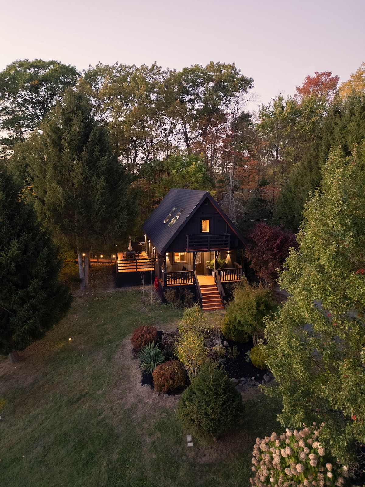 Welcome to the Oasis Skylight nestled on 10 acres of land in natural surroundings. A stylish retreat that blends luxury and nature with vaulted ceilings, sleek black-and- natural wood design, and panoramic windows. Enjoy a fully stocked chef’s kitchen, cozy custom nooks, and a lofted soaking tub. Outside, unwind in the hot tub sauna and spa or by the beautiful pond, all surrounded by serene mountain views.