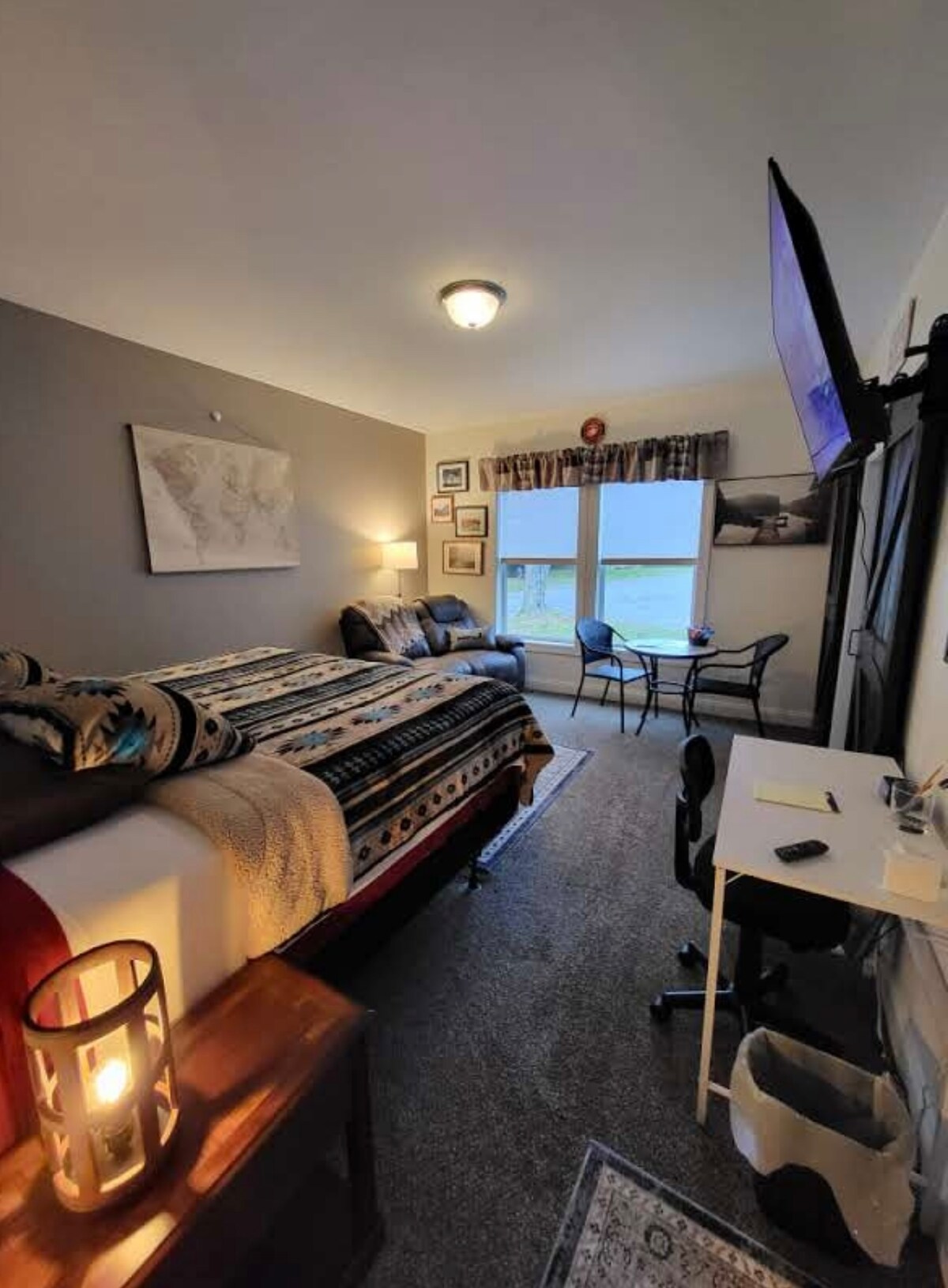 Take it easy at this unique and tranquil getaway. Perfect for one or two Adults. Comfortable King Size Bed, private bath, kitchenette (not a kitchen) with airfryer/toaster oven, microwave and keurig. Take time away from the hustle and bustle and stay closer to nature in this lovely private suite. Linens, towels and numerous kitchen items provided. Plenty of popular activities and scenery in the surrounding towns and villages. Complimentary WIFI is available but can be unreliable.