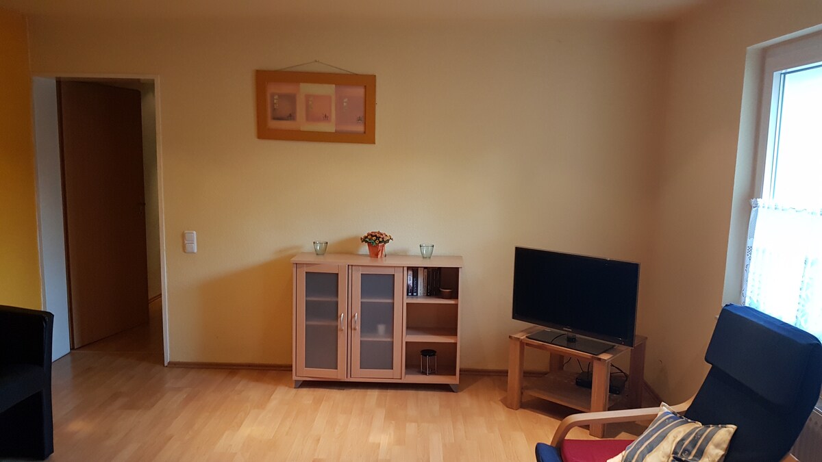 Renovierte, mit neuen Fenstern, modern ausgestattete Wohnung, ruhig, 52 qm mit Balkon, W-LAN, Schlafzimmer, Wohnzimmer, vollausgestatteter Küche, Bad und Flur, mit Smart-TV, Waschmaschine und Trockenraum im Keller für max. 3 Personen, auf Wunsch Rechnung mit Mehrwertsteuerausweis