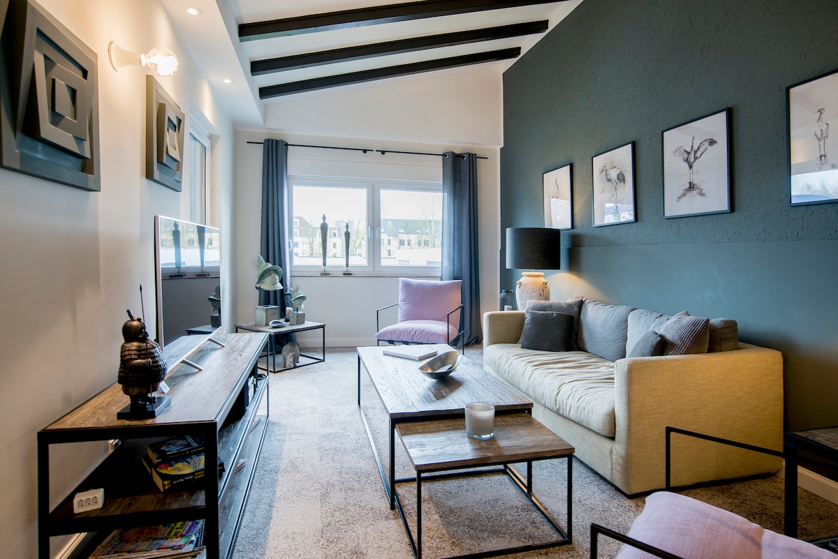 This spacious, bright duplex apartment offers everything to make you feel at home. Fully equipped with premium-quality, modern designer furniture and state of the art technical devices this secluded home is located in the sophisticated area of Düsseldorf Benrath. It's proximity to public transportation makes it easy to get to the Fair Trade/MESSE, airport, inner city of Düsseldorf and to Cologne. The river Rhine and Benrath castle, restaurants & grocery stores are just in walking distance.