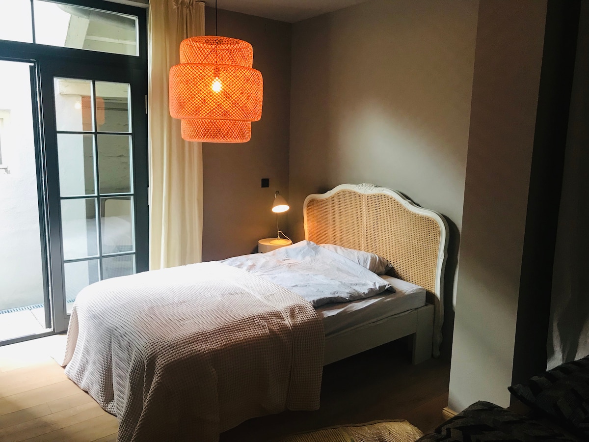 Großzügige Wohnung mit eigenem Eingang und privater Terrasse Die Wohnung bietet getrennte Räume für Schlafzimmer, Wohnzimmer und Küche sowie zwei Badezimmer. Sie liegt in einer ruhigen Sackgasse in einem verkehrsberuhigten Bereich. Das Schlafzimmer ist mit einem Boxspringbett ausgestattet, das in zwei Einzelbetten umgewandelt werden kann. Im Wohnzimmer gibt es einen Fernseher und eine Schlafcouch. Rauchen ist auf der Terrasse erlaubt.