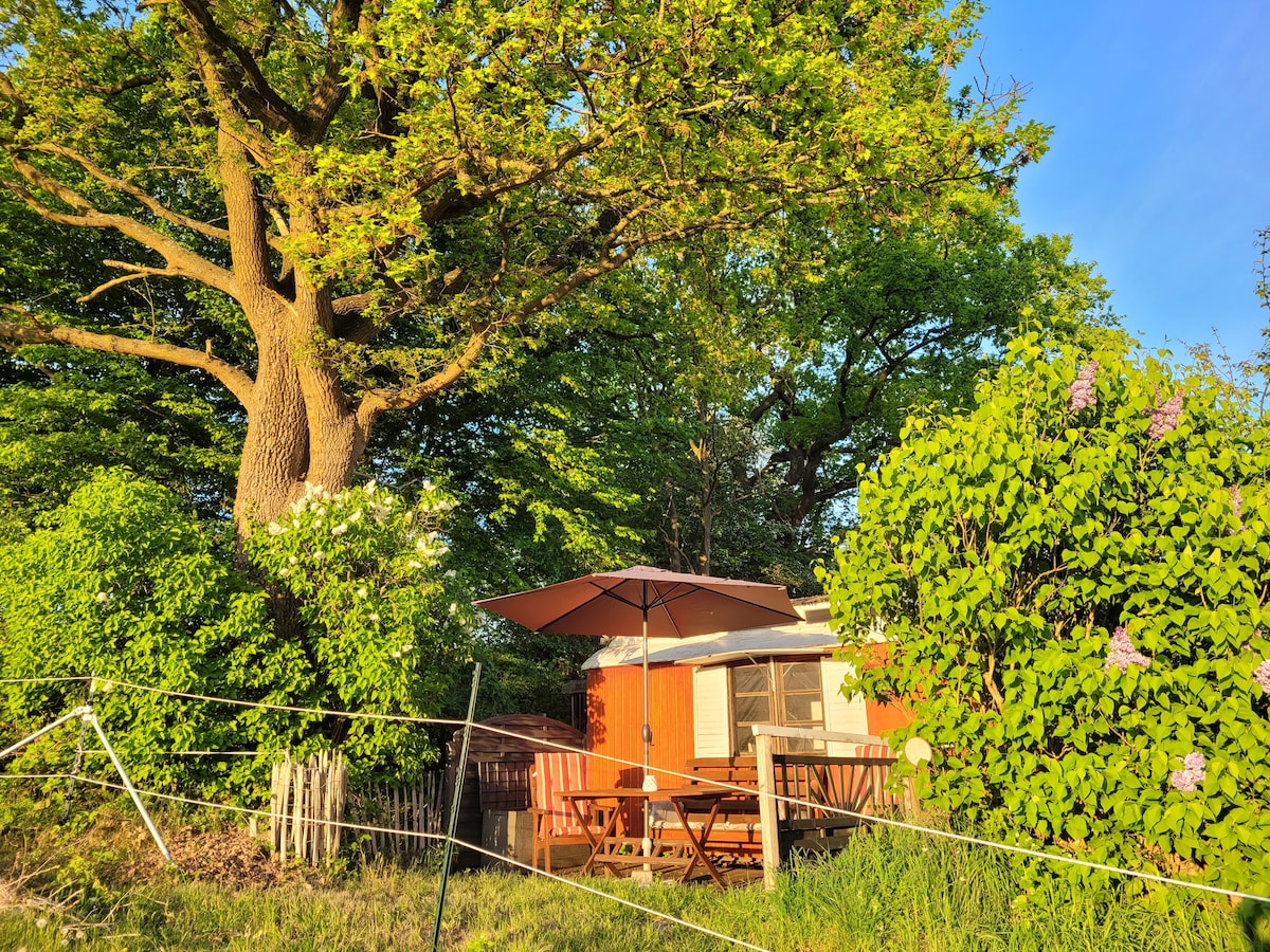 Übernachte doch mal in unserem gemütlichen Wohnbauwagen Michel, mit Oberlicht. Mit Liebe eingerichtet, ein echtes Erlebnis! Der Wagen ist 2017 ausgebaut, bietet Platz für zwei Personen, hat eine kleine Kochnische mit zwei Platten und ein Duschbad. Auf der Terrasse direkt vor dem Bauwagen lässt es sich gemütlich ausruhen, der Blick schweift über Wiesen und Felder und unsere Hauskoppeln.
