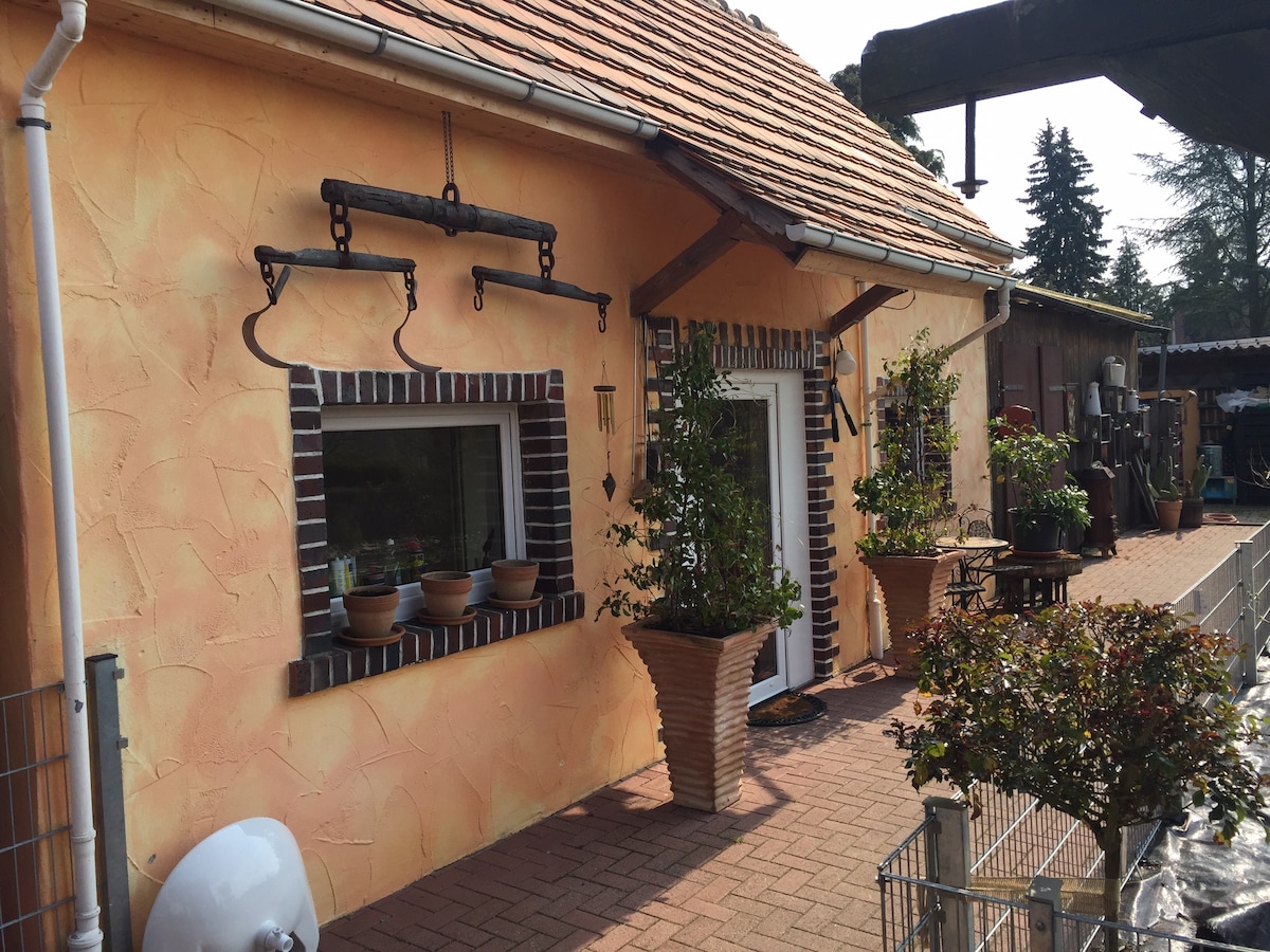 Sie wohnen im Erdgeschoss des neu umgebauten Wirtschaftsgebäudes eines alten Bauernhofes. Grosser Garten mit Paddock und 3 Pferden an einem kleinen Bach. Keine Angst darf man vor freilaufenden Hühner und unserem Herder Hund Jule haben. Es gibt eine zubuchbare Sauna und ein kleines Schwimmbecken. Sitzecke mit Feuerstelle im Garten kostenlos. Kosten für Sauna zusätzlich 15 € pro Saunagang für 2 Personen nur in Absprache vor Ort. ebenso zubuchbar ist spazieren mit den Pferden.